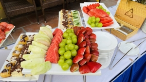 Trong bữa tiệc, vừa có bánh, vừa có trái sẽ giúp người thưởng thức không bị ngán. Đồng thời, việc trang trí sẽ có nhiều màu sắc và khách mời cũng sẽ có nhiều sự lựa chọn hơn. Gợi ý là bạn nên ưu tiên những loại trái cây như xoài, nho, táo, thơm, ổi, dâu tây, dưa… sẽ khô ráo và để được lâu hơn. Không nên chọn những loại trái cây có mùi nặng như sầu riêng hoặc nhanh hư hỏng: đu đủ, bơ…